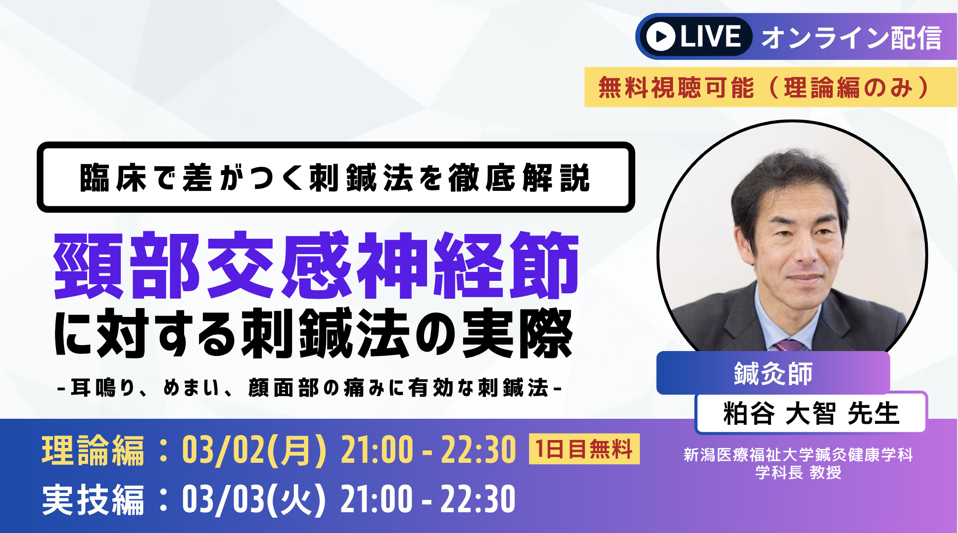 【ライブセミナー】「頸部交感神経節に対する刺鍼法の実際-耳鳴り、めまい、顔面部の痛みに有効な刺鍼法-」