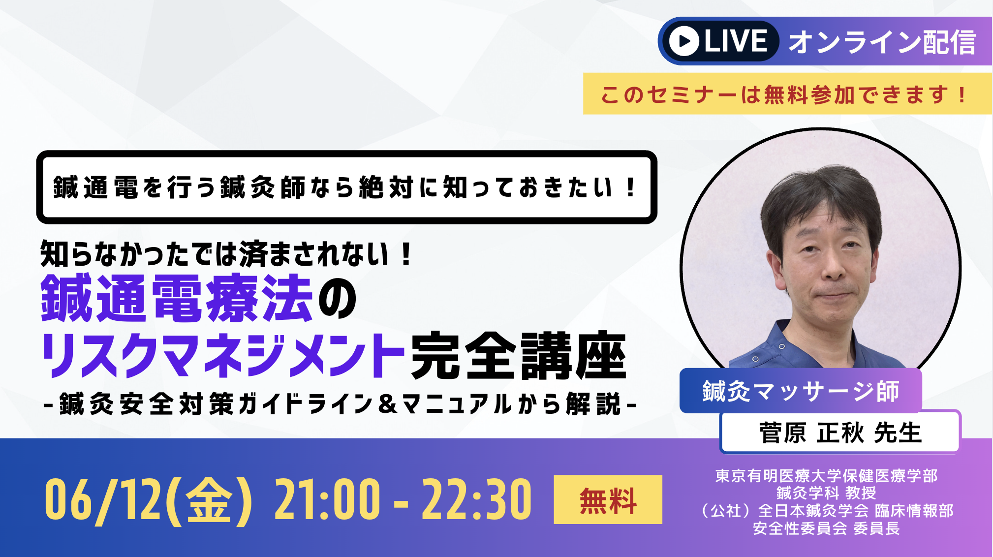 今回は、全日本鍼灸学会の安全性委員会委員長である菅原正秋先生を講師に迎え、鍼灸師が必ず知っておくべき鍼通電療法のリスク管理を徹底解説していただきます。